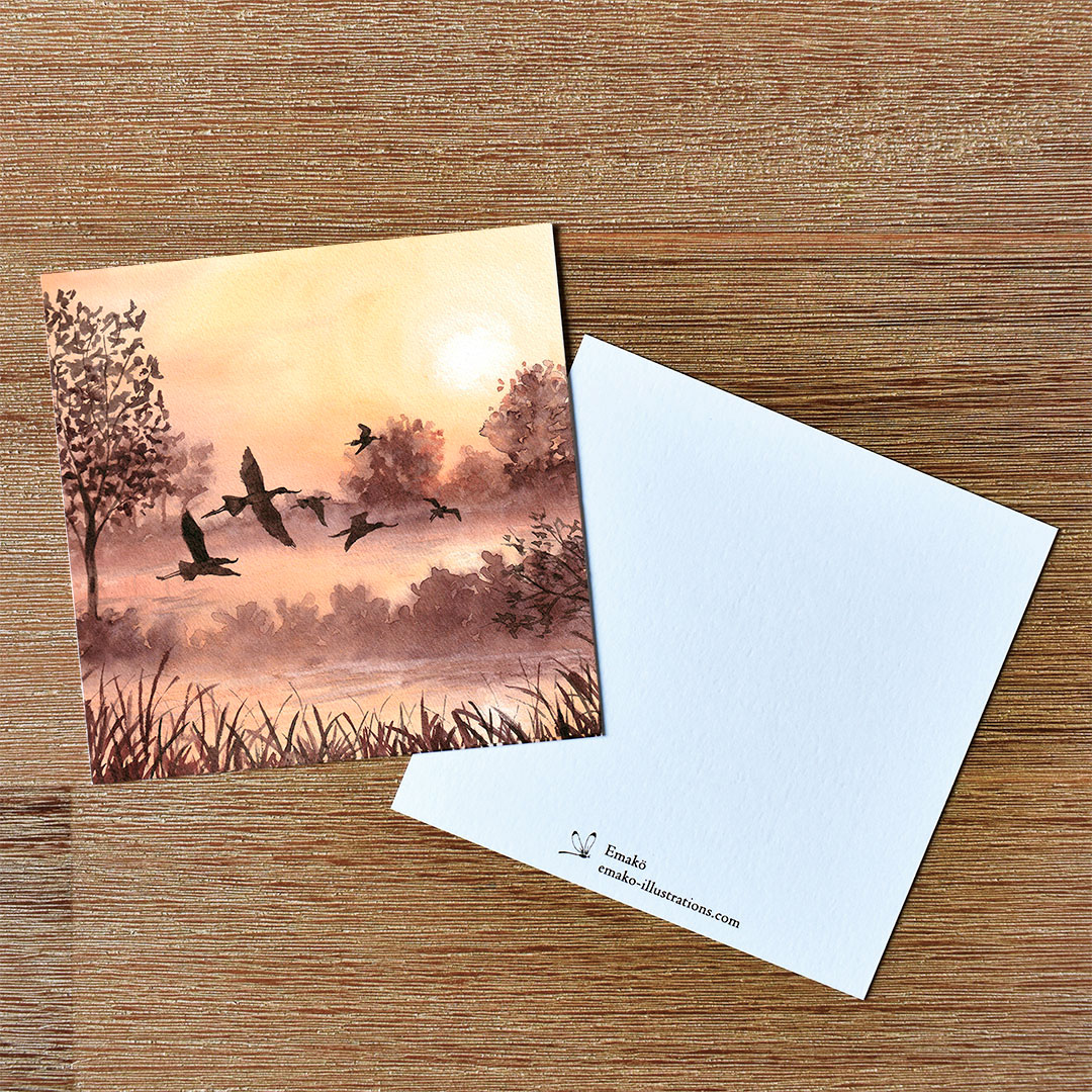 Elle fait partie du set de cartes de vœux Les Ombres du Marais, une série d’illustrations inspirées de mes observations d’oiseaux présents sur le bassin d’Arcachon, auréolés de cette lumière si particulière de début de journée.